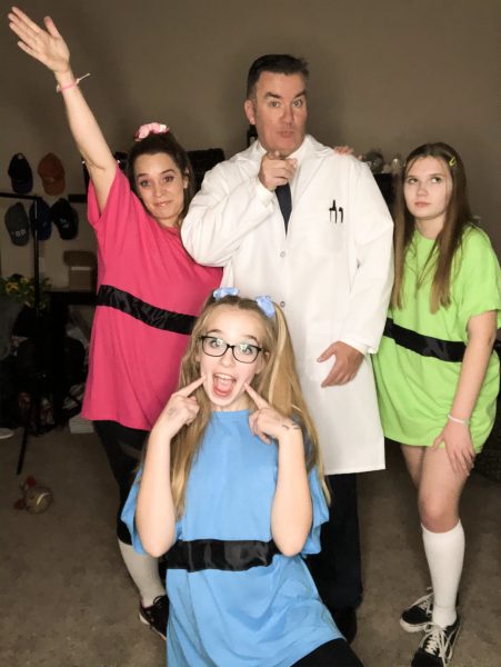 And lastly, in 2019 we did this Powerpuff Girls group costume. We did this mainly because our oldest daughter and two of her friends dressed up as Powderpuff girls. All I had to do was make two shirts and find a Dr’s coat for Jason.