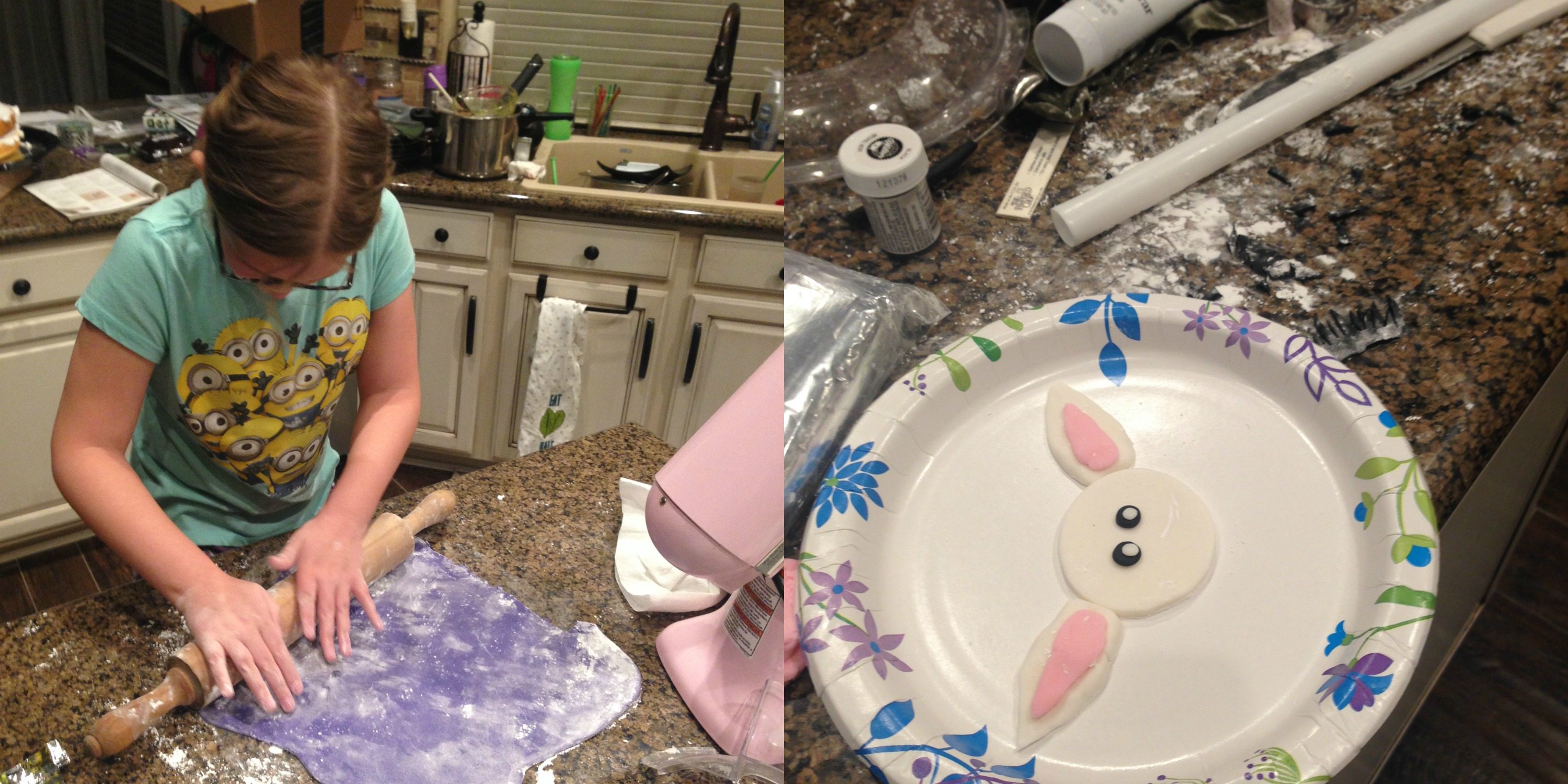 The next part of the project was to roll out the fondant and make some decorations! Because I was short on time and didn’t have a ton of colors to make for this cake, I went ahead and bought the purple colored fondant from JoAnn’s! If there were lots of colors I usually color the white fondant myself. The girls had fun rolling out the fondant and helping me put them on the cake!